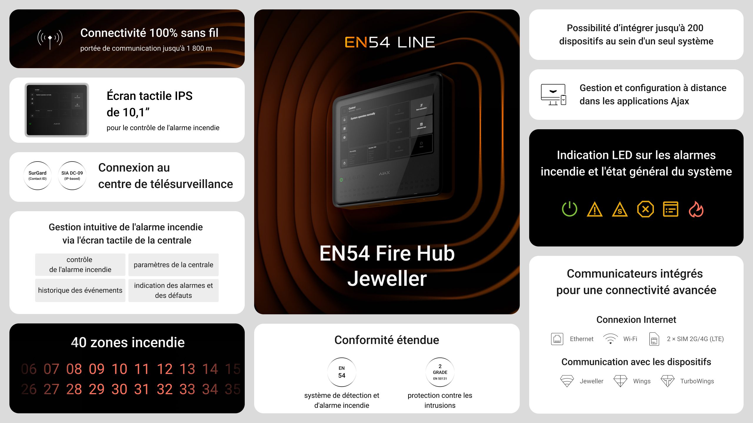 Rencontrez Type4 Fire Hub Jeweller — équipement d’alarme incendie à écran tactile conçu pour une gestion complète du système d’alarme incendie. Le dispositif est facile à installer, simple à utiliser et ne nécessite pas beaucoup d’entretien. Il est spécialement conçu pour les sites de Type 4 et dispose de communicateurs Ethernet, cellulaires et radio intégrés pour une connectivité transparente sur l’ensemble du système. Avec son grand écran tactile et son interface intuitive, l’équipement d’alarme incendie fournit des informations détaillées sur le statut du système et des notifications d’alarme, garantissant que le personnel est immédiatement informé de tout incident.